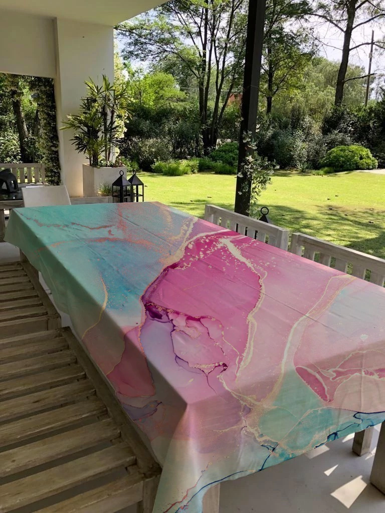 Manteles estampados en tela repelente a líquidos y cuerina plavinil.