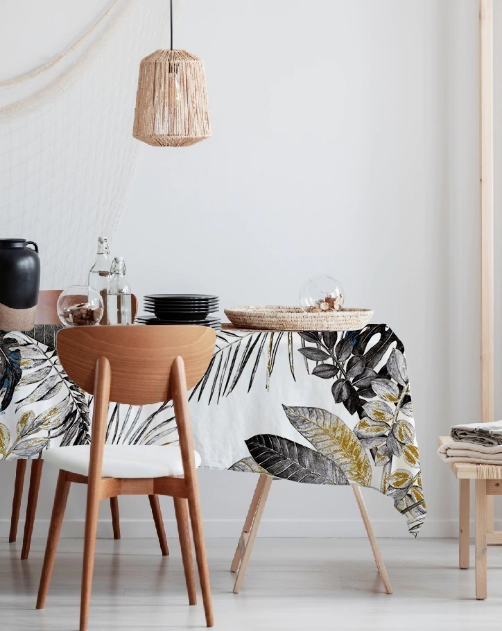 Manteles estampados en tela tropical repelente. (Tela repelente a líquidos).