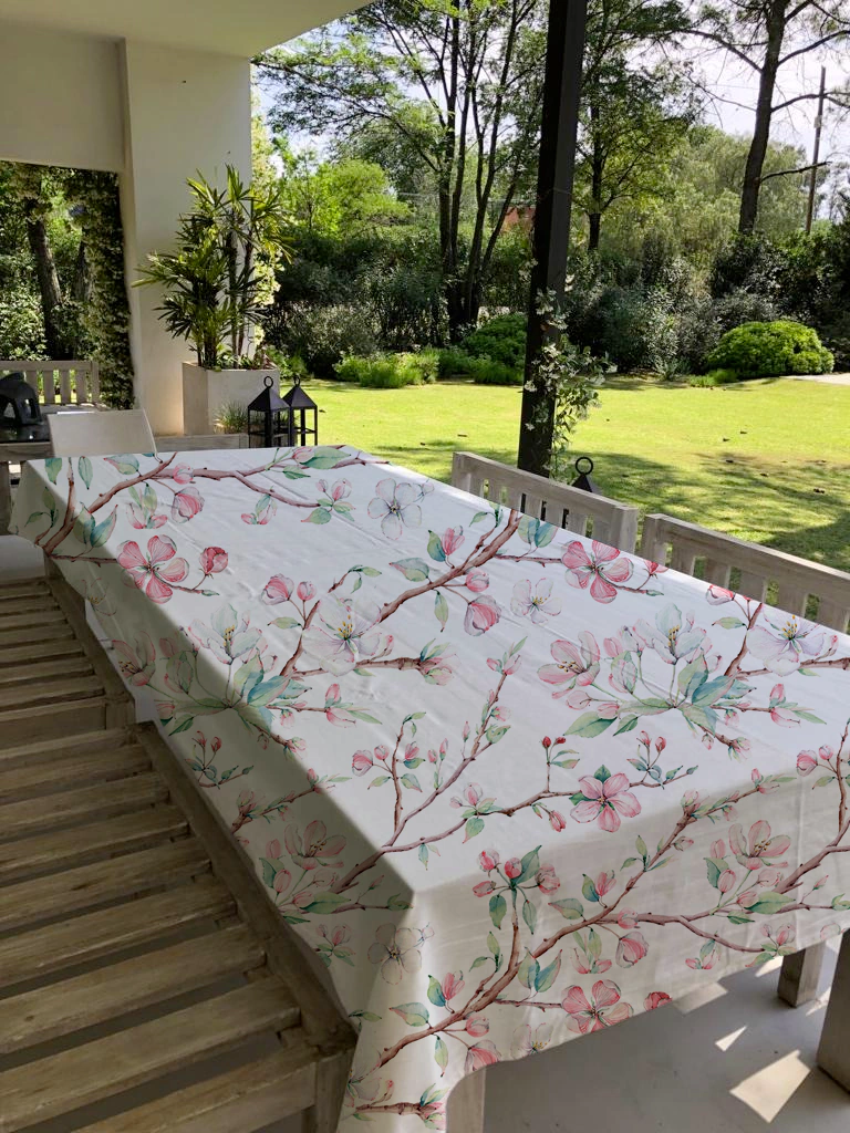 Manteles estampados en tela tropical repelente. (Tela repelente a líquidos).