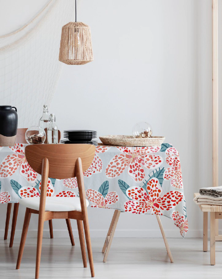 Manteles estampados en tela tropical repelente. (Tela repelente a líquidos).