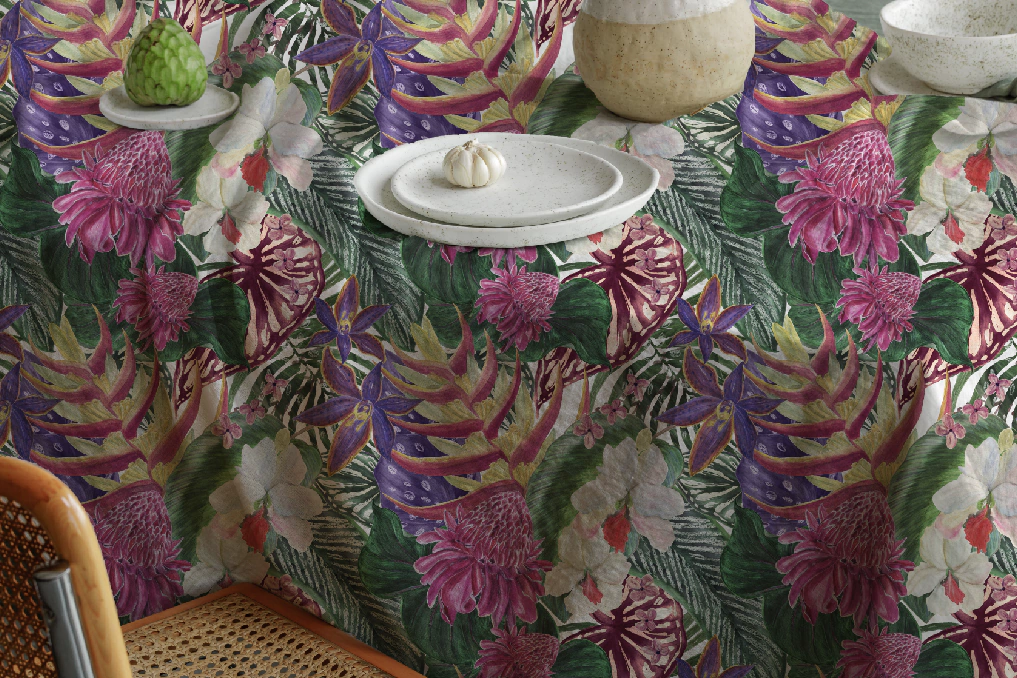 Manteles estampados en tela tropical repelente. (Tela repelente a líquidos).